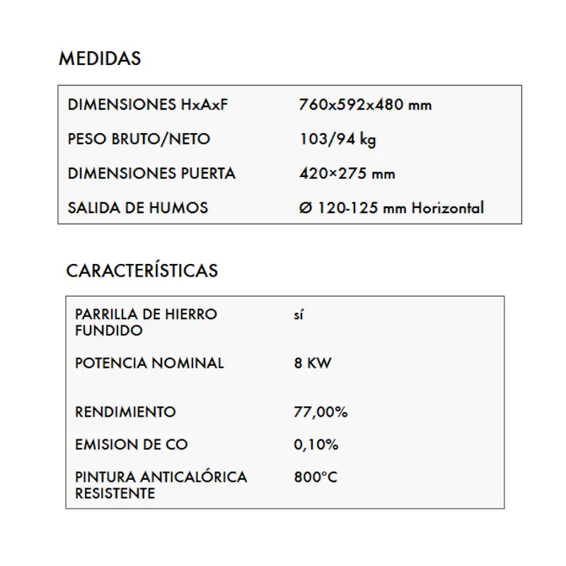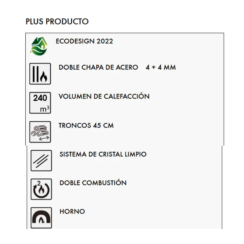 La estufa Castilla de Panadero es un modelo de leña con diseño rústico y doble cuerpo de acero, caracterizado por su potencia de 8 kW, rendimiento del 77% (en versiones EcoDesign) y la capacidad de calentar hasta 240 m³. Su diseño incluye una parrilla de hierro fundido, un horno calientaplatos superior y la capacidad para troncos de hasta 50 cm. Las versiones EcoDesign 2022 cumplen con normativas de emisiones y eficiencia, y son estancas para una mejor combustión.