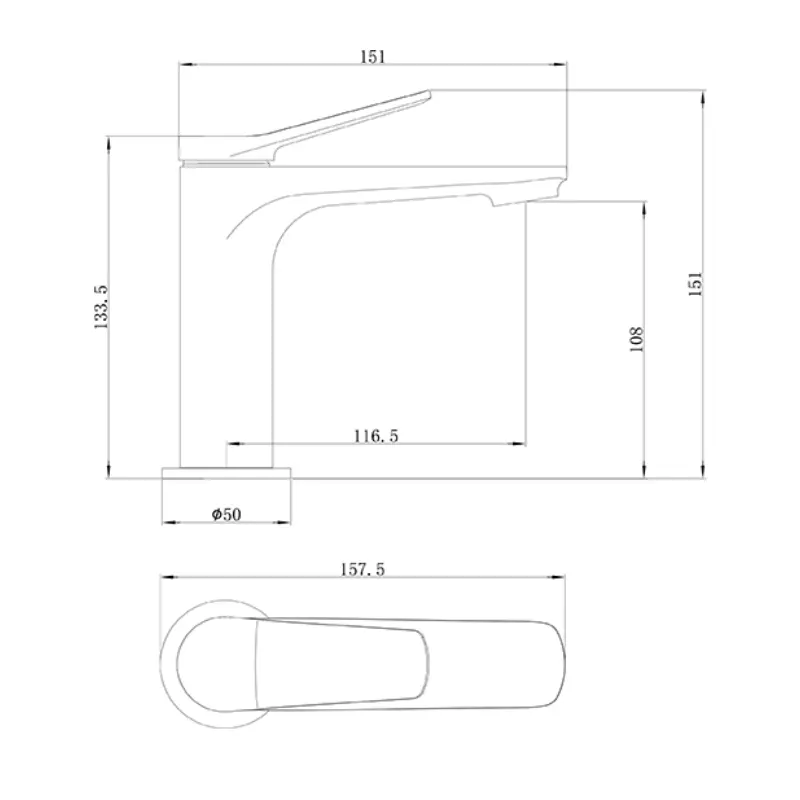 • Dimensiones: El modelo estándar presenta una altura total de 151 mm y una proyección del caño de 116,6 mm.